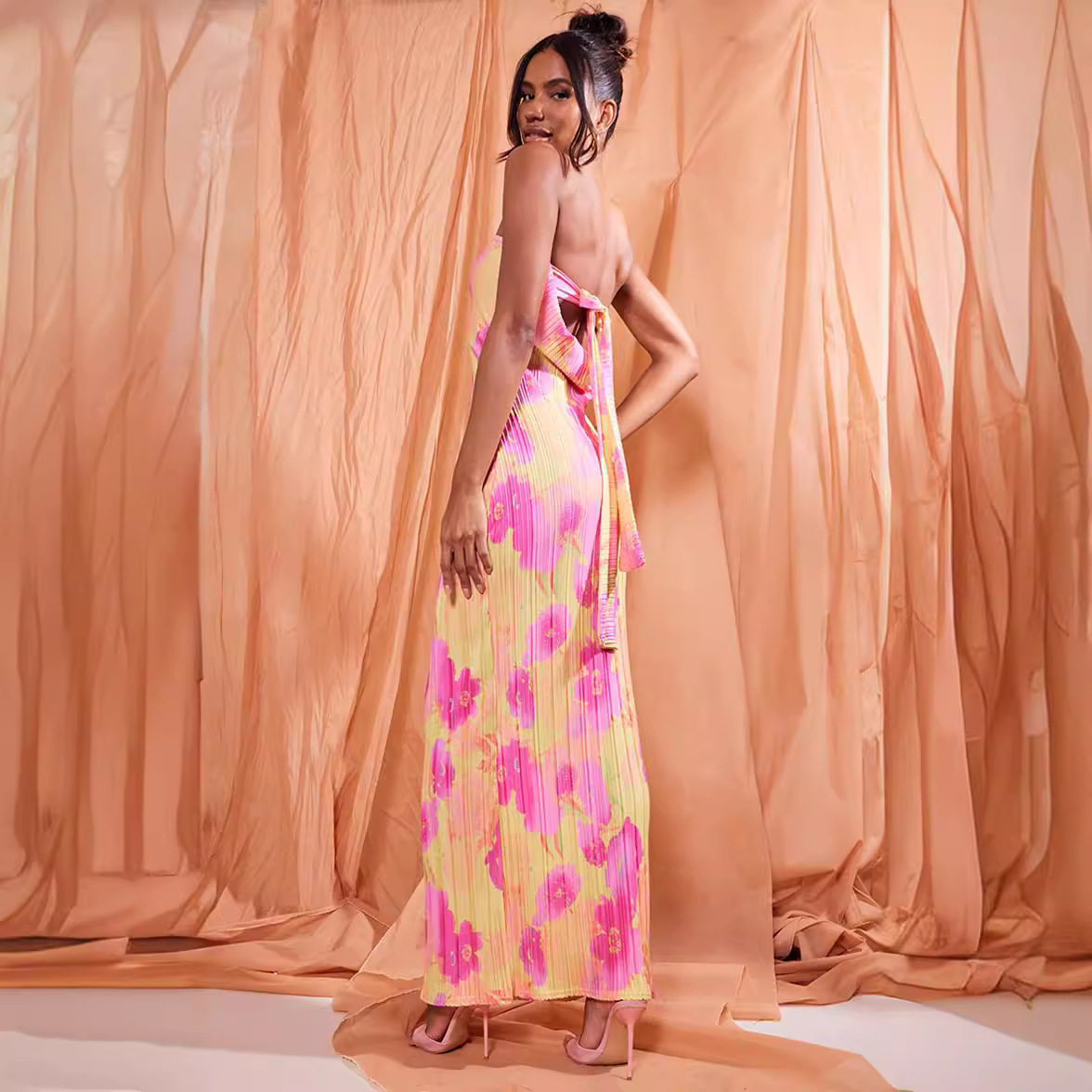Popular Tube Top Printed Pleated Slim Bow Long Dress