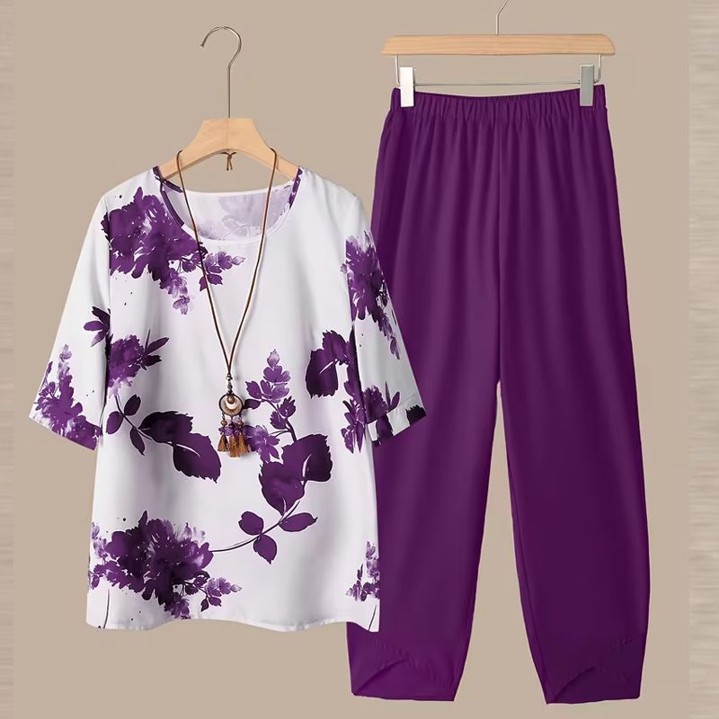Women's Purple Floral Print Linen Cotton Loose Two-Piece Outfit