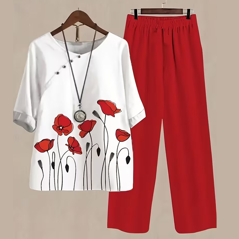 Women's Gradient Floral Print Linen Cotton Loose Two-Piece Outfit