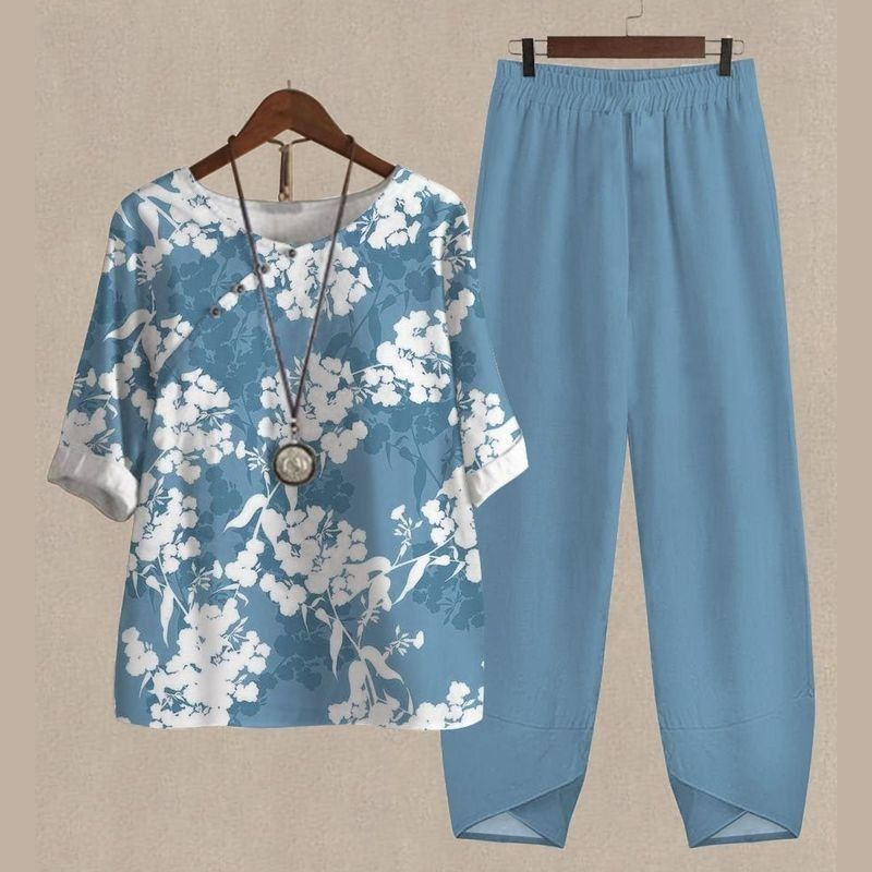Linen Cotton Blend Blue Tone Floral Relaxed Two-Piece Outfit