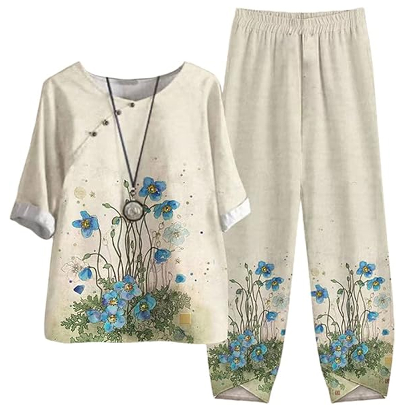 Casual Summer Artistic Floral Print Linen Cotton Loose Two-Piece Set