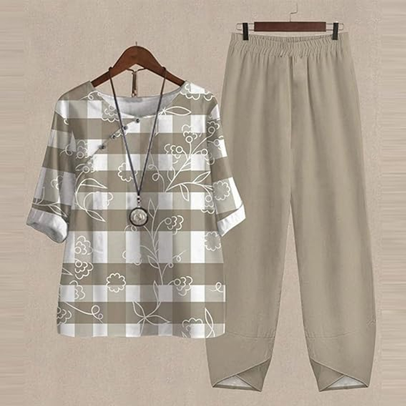 Casual Summer Plaid Floral Print Linen Cotton Loose Two-Piece Set