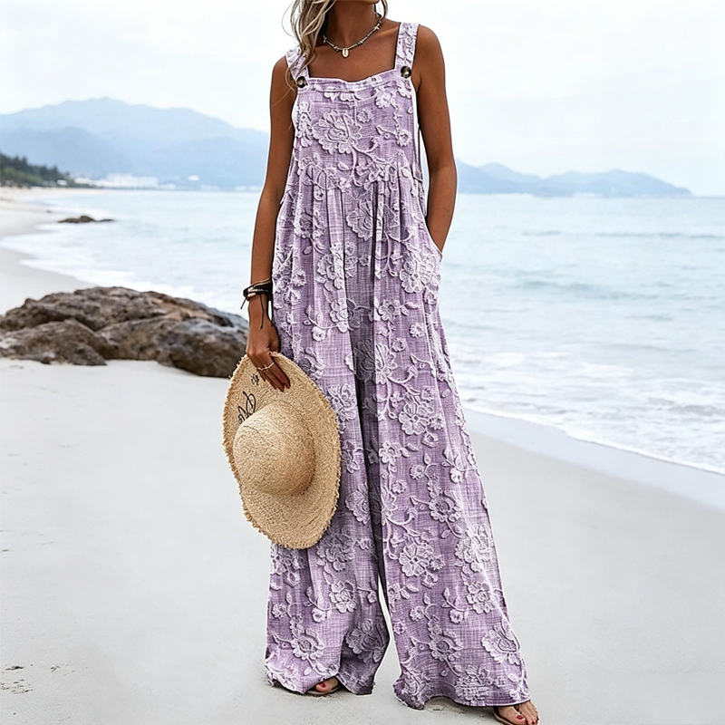 Women'S Bohemian Style Purple Floral Print Beach Casual Wide-Leg Overalls