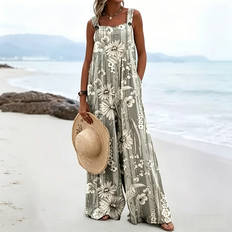 Women'S Linen Blend Bohemian Style Art Striped Floral Print Beach Casual Wide-Leg Overalls