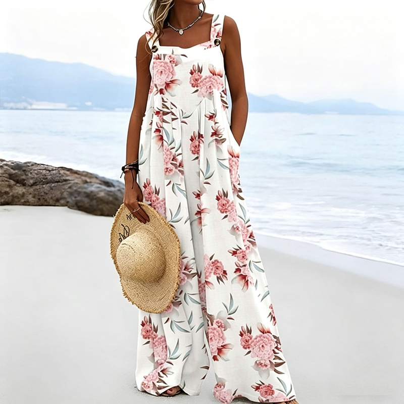 Women's Summer Linen Blend Elegant Floral Print Double Pocket Strap Wide-Leg Pants