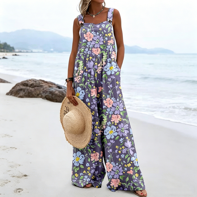 Women'S Summer Linen Blend Floral Floral Pocket Overalls Wide-Leg Pants