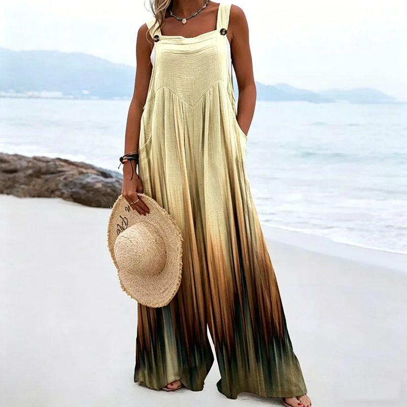 Women'S Summer Linen Blend Vintage Tie-Dye Print Pocket Overalls Wide-Leg Pants