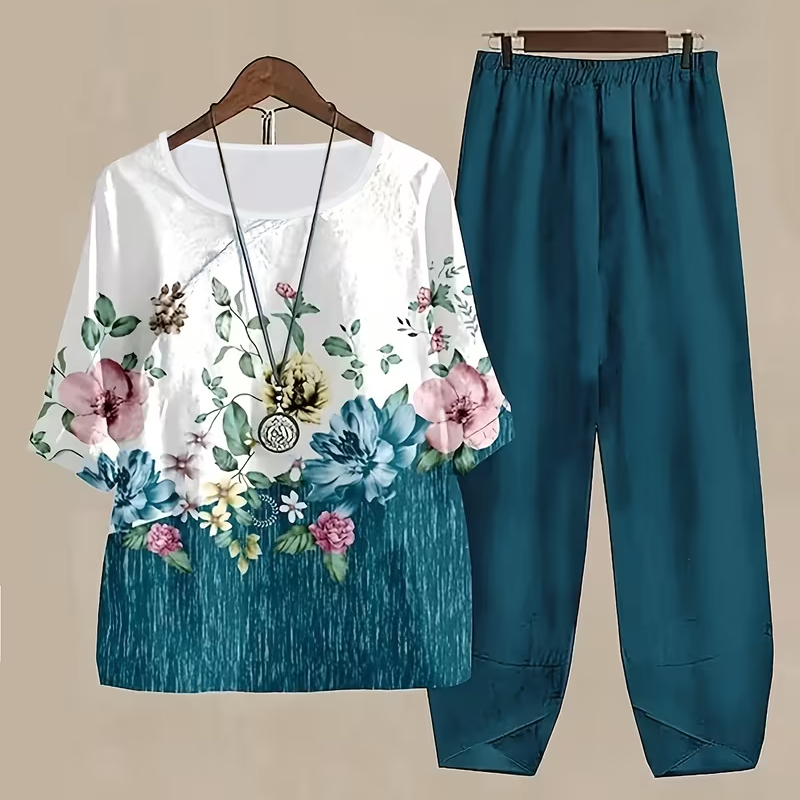 Women's Gradient Floral Print Linen Cotton Loose Two-Piece Outfit